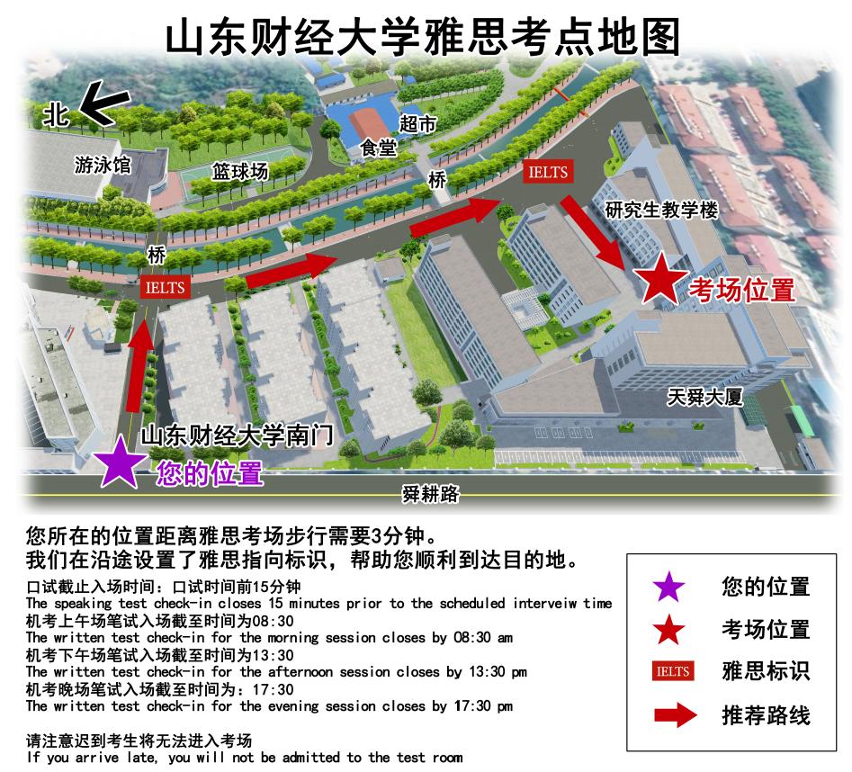 Your Computer-delivered test/Speaking test will take place at West Side, 1F Postgraduate Teaching Building, Shungeng Campus, Shandong University of Finance and Economics.