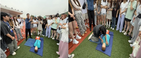 针对国外公共场所广泛配备AED设备的现状,本次演练新增了AED使用培训环节。指导老师通过人体模型,演示了心肺复苏和AED配合使用的完整流程。"首先要确保环境安全,然后检查反应和呼吸..."指导老师手把手指导学生进行练习,强调黄金4分钟的重要性。学生们分组练习了胸外按压、人工呼吸和AED操作,掌握了基本的急救技能。这些技能不仅在校园中有用,也为他们海外生活提供了安全保障。
