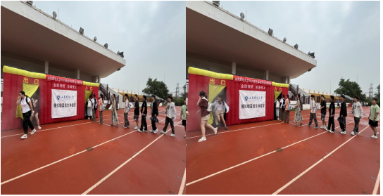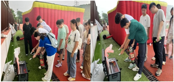 在模拟烟雾逃生体验环节,同学们利用学校搭建的专业充气式烟雾逃生体验屋。屋内模拟真实火场环境,充满了无害的橙色模拟烟雾,能见度极低。同学们按照指导,捂住口鼻,弯腰低姿沿墙壁快速前行。安全指导员在现场不断提醒:“不要慌张,注意脚下,按照安全指示标志方向逃生。”这种模拟体验使同学们在接近真实的场景中,增强了对低姿前行、捂住口鼻等逃生自救知识的认识,更加直观地感受了消防安全的重要性。